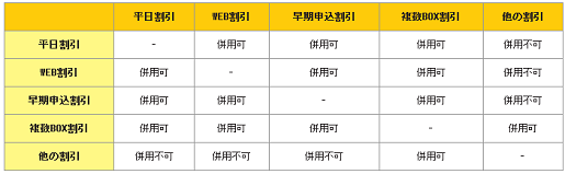 平日割引・早期申込割引・複数BOX割引以外の割引サービスとは併用不可